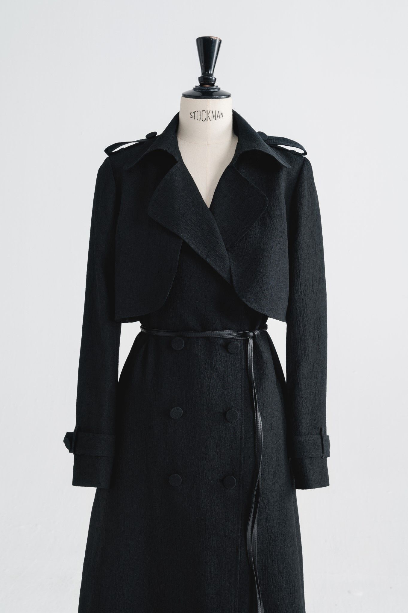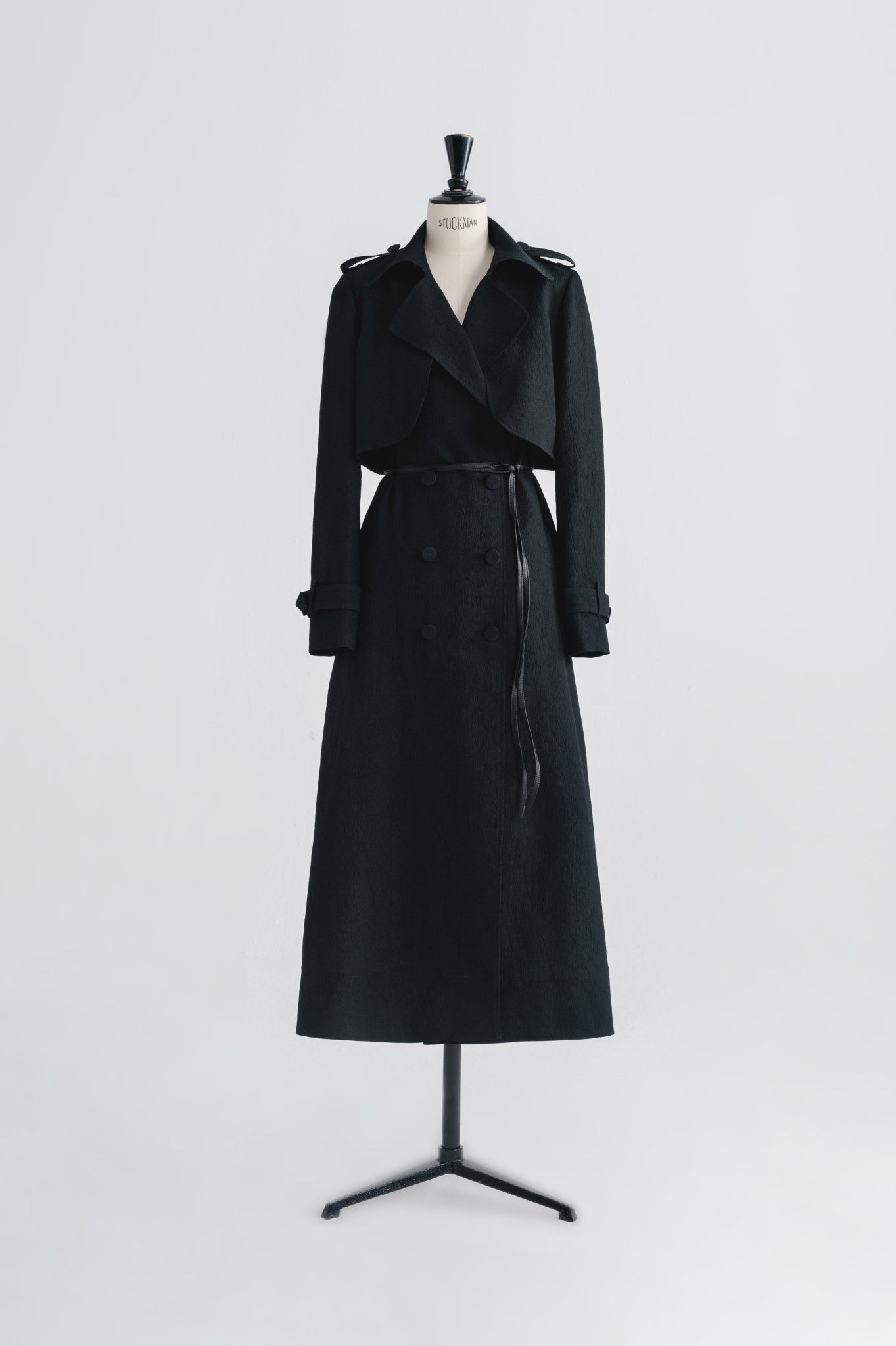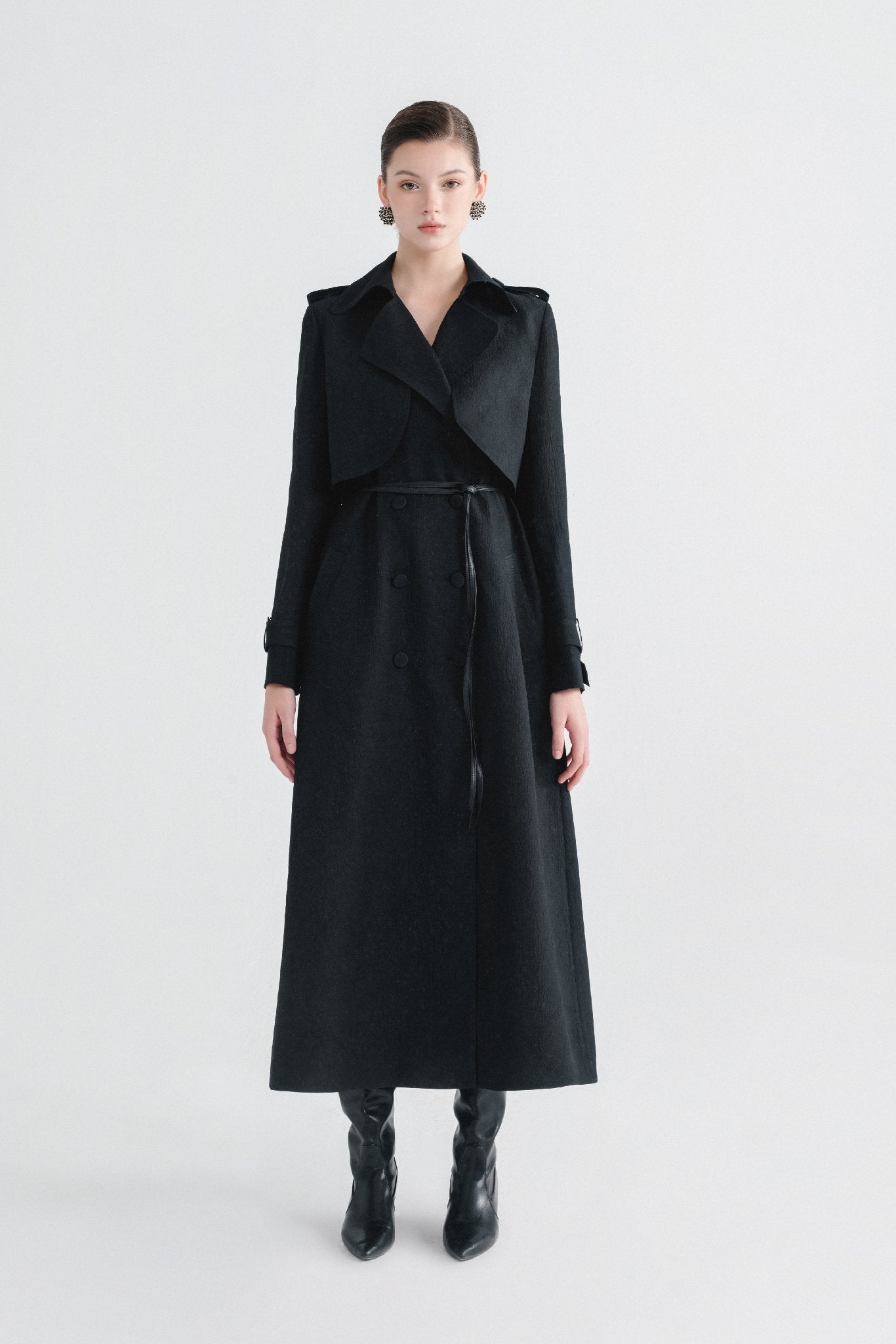 Laura Ren presents a timeless trench silhouette elevated by a double-breasted wool blend construction, designed for modern elegance and transitional layering. This piece features sharp tailoring with wide notched lapels, buttoned epaulettes, and a detachable waist tie for a customizable fit. The structured cropped overlay and calf-length hemline bring architectural refinement to a classic coat style. Perfect for seasonal transitions, this trench coat merges functional warmth with fashion-forward sophistication. A refined outerwear staple for contemporary wardrobes from Laura Ren.