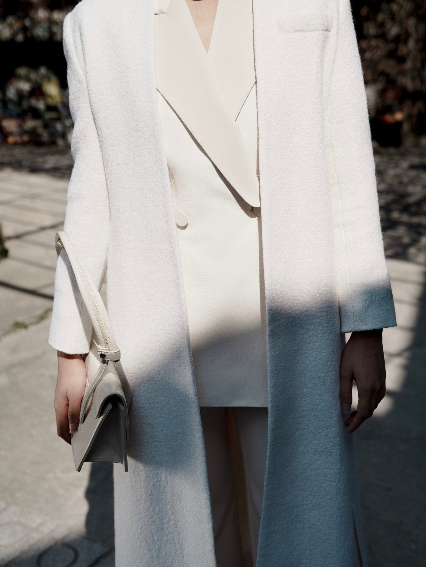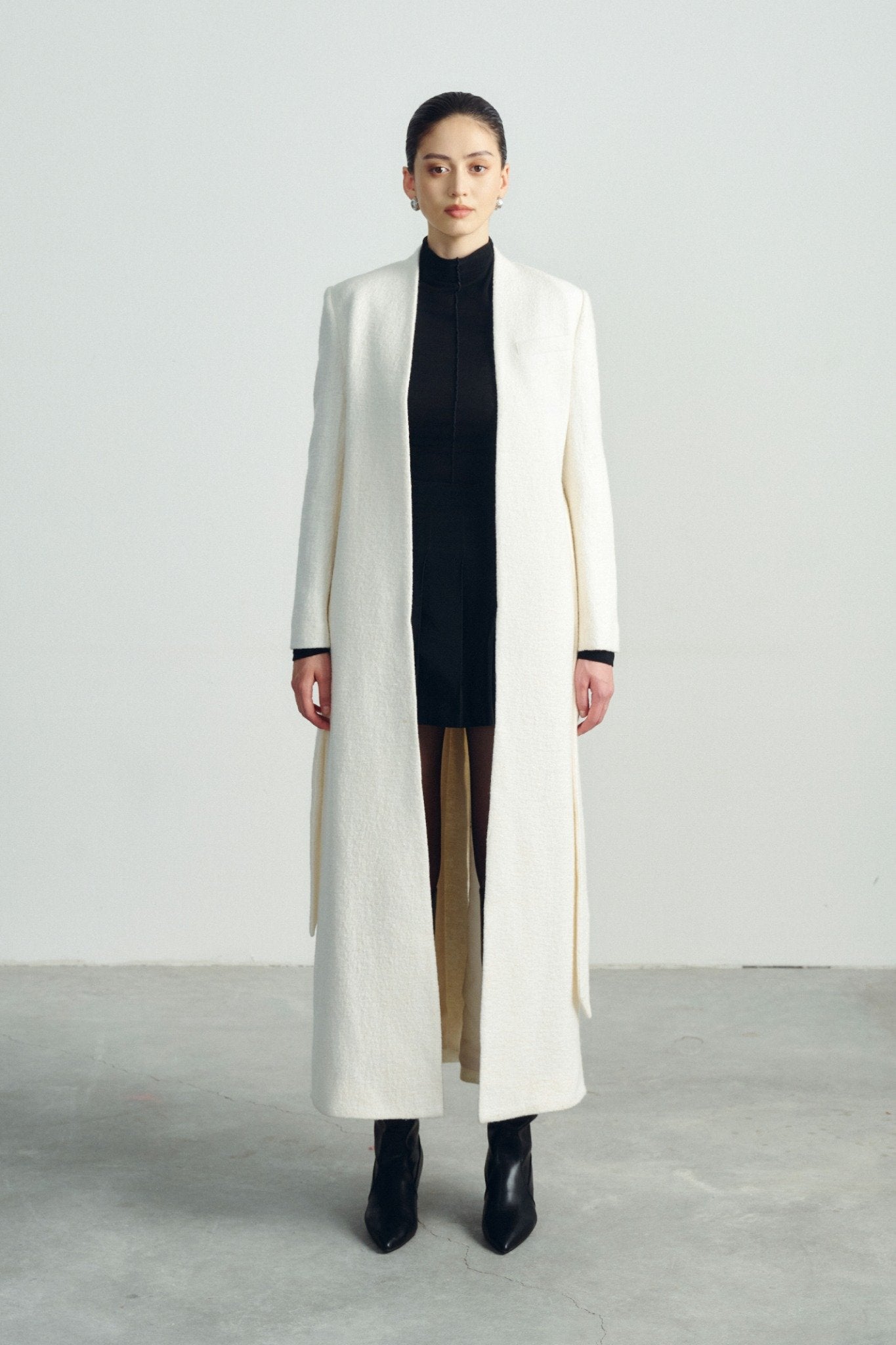 Crafted from premium textured wool, this long coat by Laura Ren is designed for effortless elegance and transitional warmth. The clean, collarless neckline and structured shoulders offer a refined silhouette, while the open front and longline cut create an elongated, flowing shape. Perfect for layering over dresses or tailored separates, this piece adds modern sophistication to any wardrobe. Whether worn belted or left open, this coat is an essential for elevated cold-weather dressing. The minimalist design ensures timeless appeal with subtle texture for added depth and charm.
