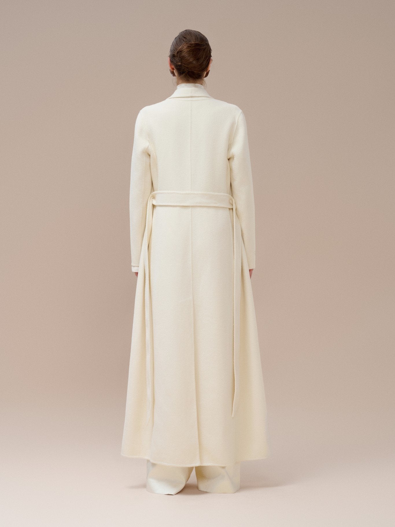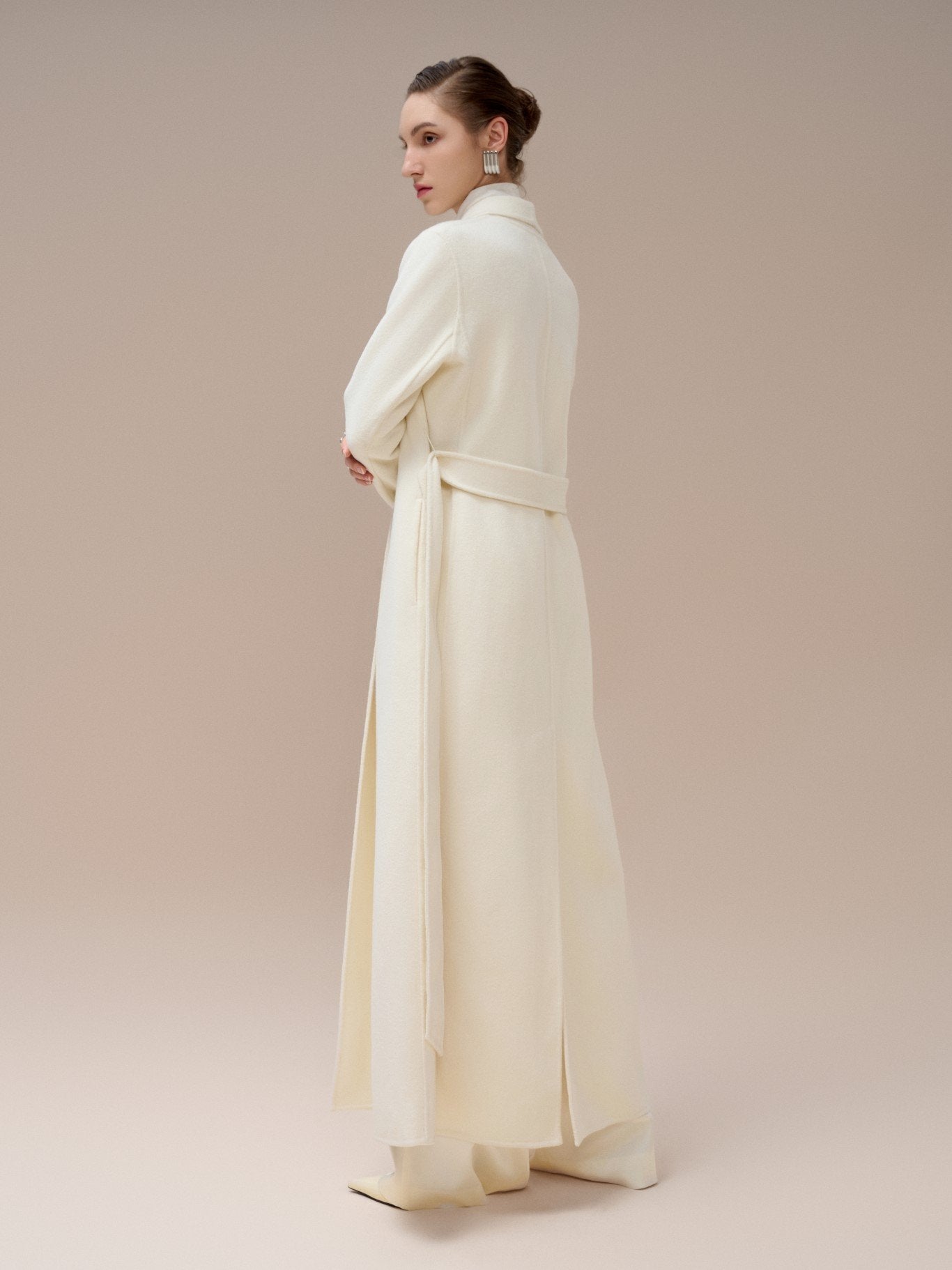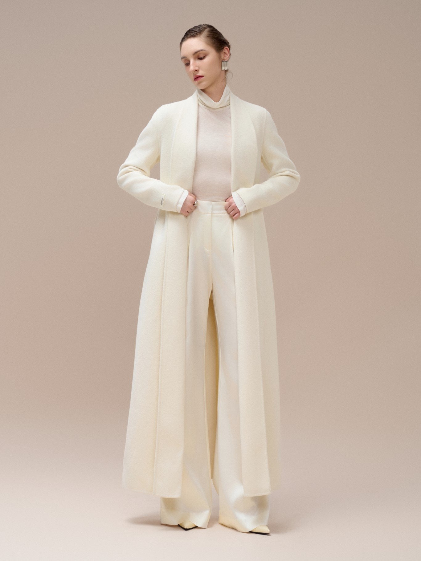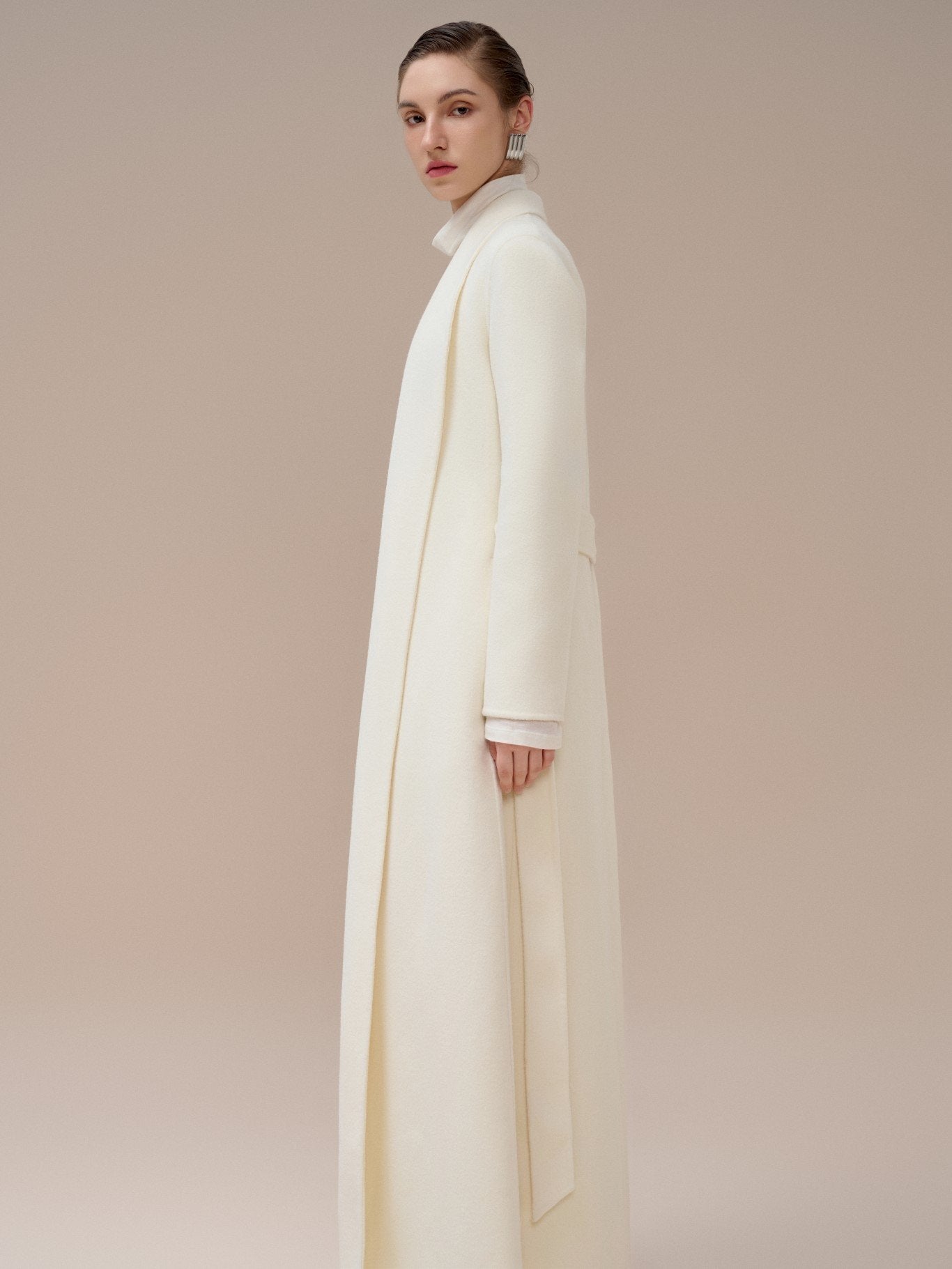 This long wool coat by Laura Ren exudes refined minimalism with its flowing silhouette and clean tailoring. The open front design is complemented by a soft shawl collar and streamlined sleeves, while a back belt detail adds subtle structure and waist definition. Crafted from high-quality wool for both warmth and a sleek finish, this coat is the ideal layering piece for transitional and winter wardrobes. Pair it with tailored trousers or monochrome ensembles for a polished, contemporary look.