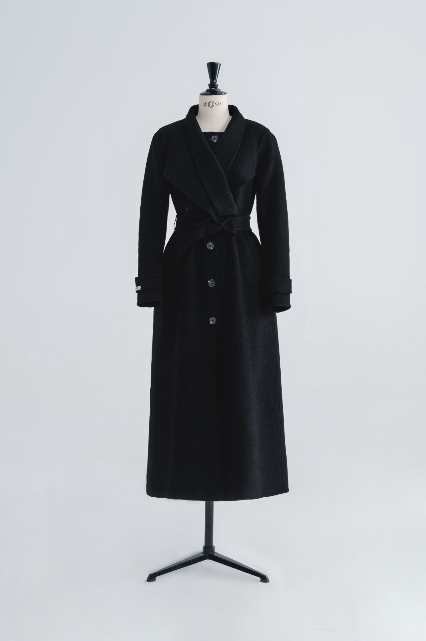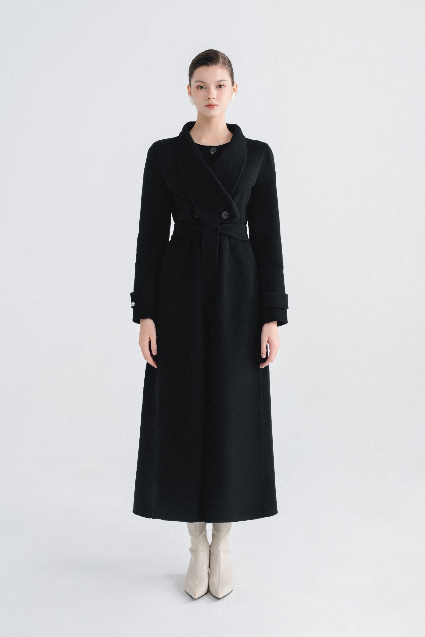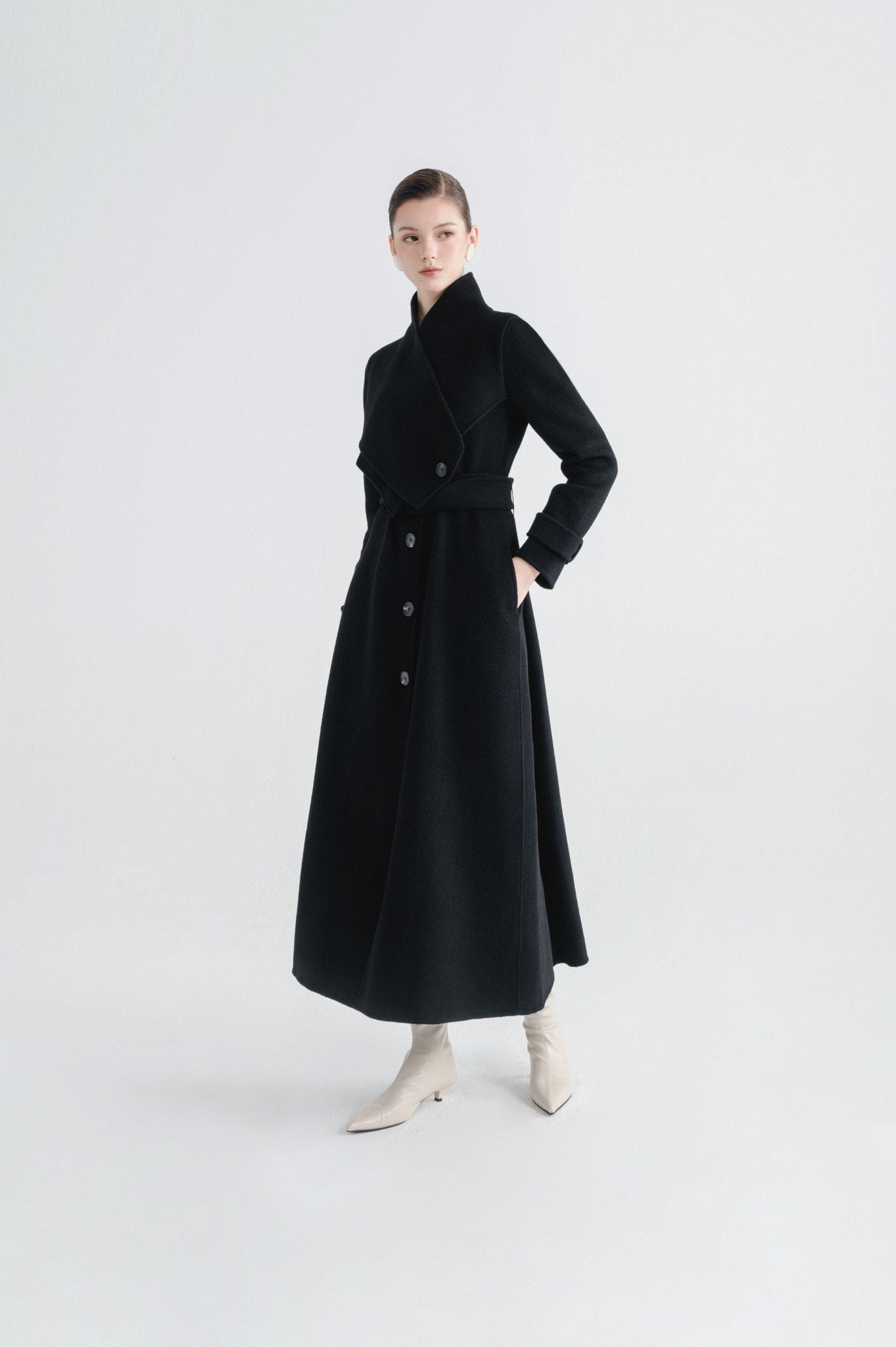 This structured wool long coat from Laura Ren delivers timeless outerwear elegance with a modern edge. Featuring a dramatic wrap-style front with oversized lapels, the coat cinches at the waist with a matching belt to create a flattering silhouette. A full-length button-down closure adds functionality and refined detailing, while the premium wool fabric provides enduring warmth and structure. Whether styled over tailored ensembles or flowing dresses, this coat is a cold-weather essential that embodies confidence and sophistication.