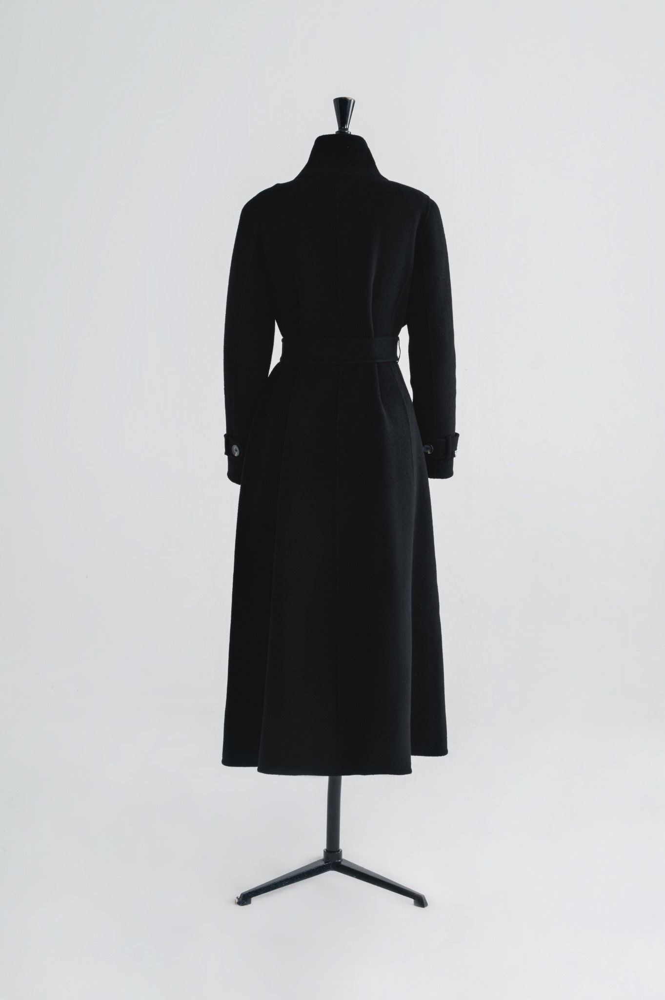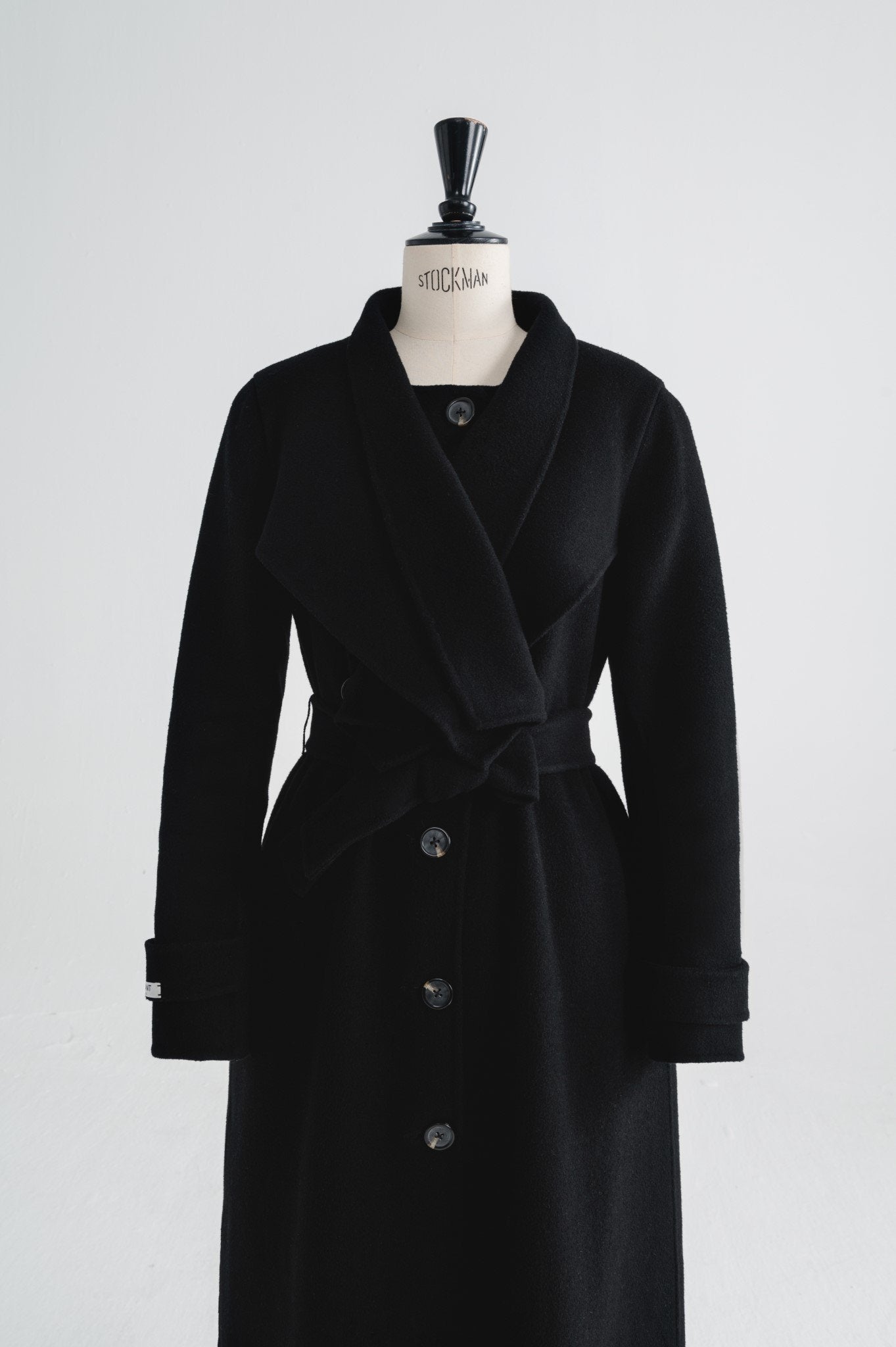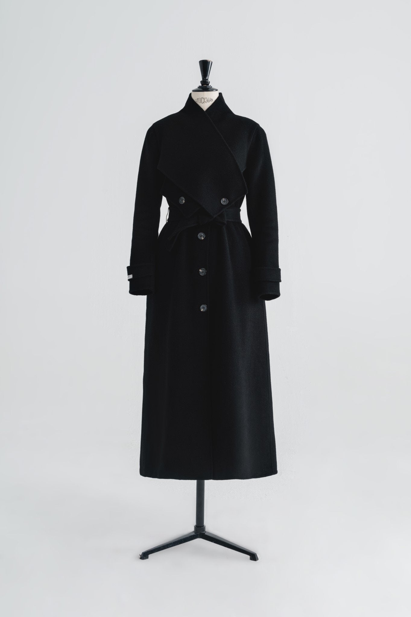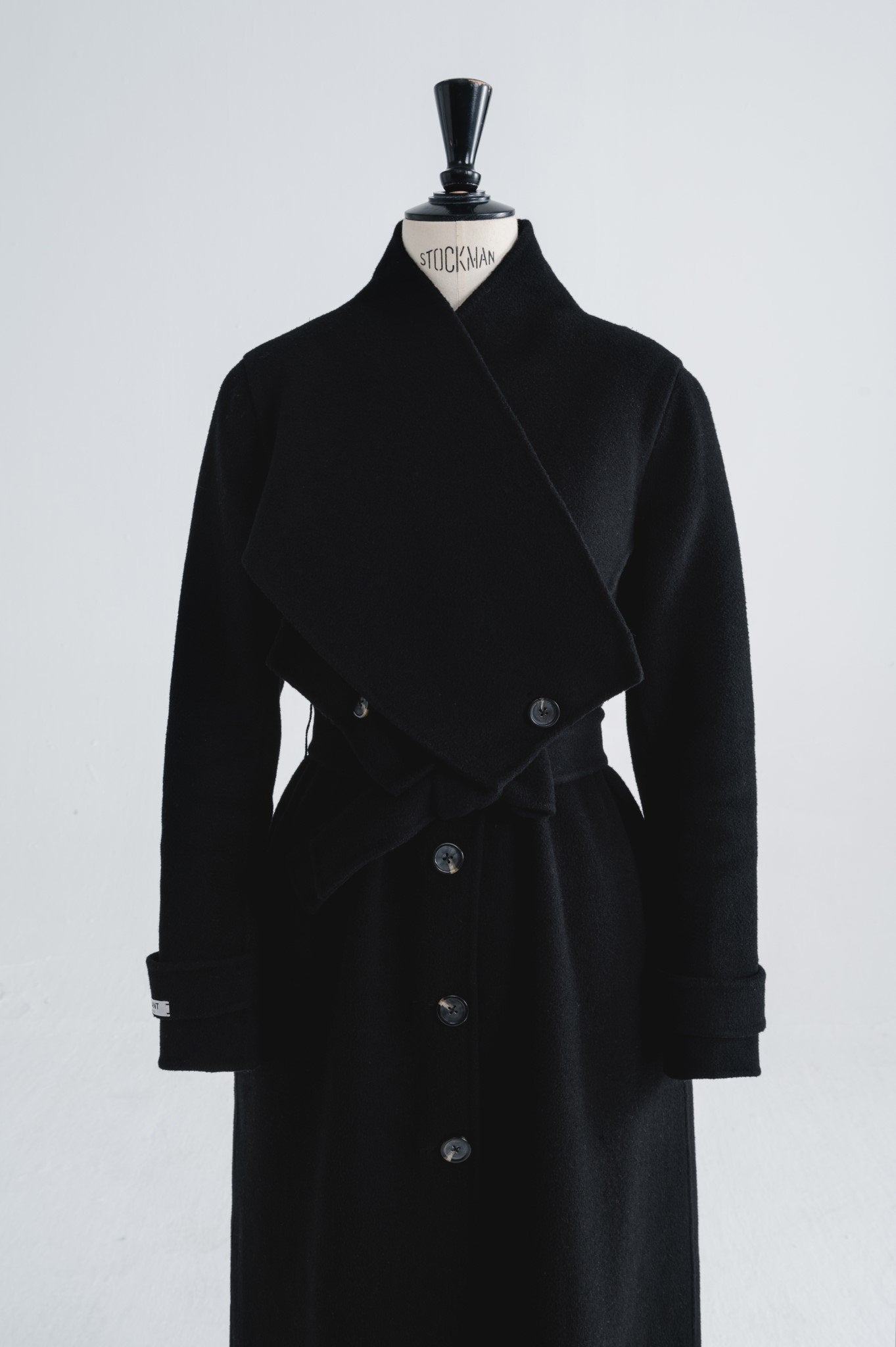 This structured wool long coat from Laura Ren delivers timeless outerwear elegance with a modern edge. Featuring a dramatic wrap-style front with oversized lapels, the coat cinches at the waist with a matching belt to create a flattering silhouette. A full-length button-down closure adds functionality and refined detailing, while the premium wool fabric provides enduring warmth and structure. Whether styled over tailored ensembles or flowing dresses, this coat is a cold-weather essential that embodies confidence and sophistication.